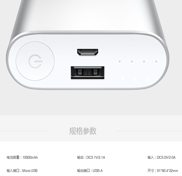小米(MI)新款移动电源/充电宝 10000mAh 银色